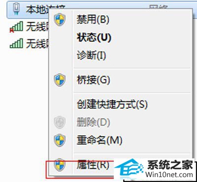 5、要建立无线网络共享,由于本地连接是有线网络连接,那么我们选择本地连接点击右键选择属性。