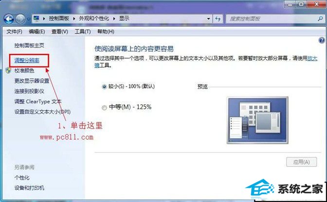第三步、在新打开的显示中窗口左侧中找到并单击【调整分辩率】。参考下图所示。
