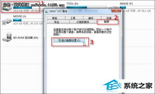 sTEp1:先右键单击你的系统所在的安装分区,选择“属性”命令进入;再切换到“配额”标签项并单击下方的“显示配额设置”按钮,如图1所示。