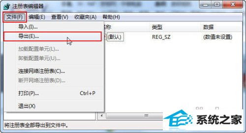 点击菜单“文件-导出”。(如果我们需要导入注册表,就在这个界面中选择“导入”。)