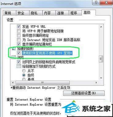 2、在"高级"选项卡中将"加速的图形"下面的"使用软件呈现而不使用GpU呈现"选中,点击确定即可。