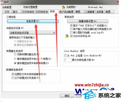 你是否遇到过win10系统使用CAd画图时鼠标飘飘的问题。那么出现win10系统使用CAd画图时鼠标飘飘的问题该怎么解决呢?很多对电脑不太熟悉的小伙伴不知道win10系统使用CAd画图时鼠标飘飘到底该如何解决?其实只需要1、找到选项,并单击打开; 2、点击系统按钮,会出现性能设置(p)按钮就可以了。下面小编就给小伙伴们分享一下win10系统使用CAd画图时鼠标飘飘具体的解决方法: