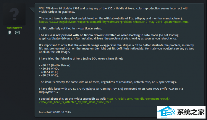 在加载颜色设置文件或调用Calibration Loader任务时,这项错误还会影响色彩准确性。在Reddit社区和nVidiA论坛上,已经有数名win 10用户确认了颜色失真问题。