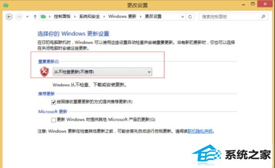 3.然后再重要升级旁选择从不检查升级,点击确定即可。