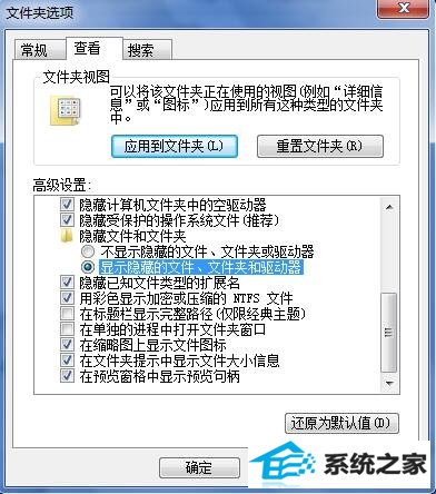 在系统打开的文件夹选项窗口里面,大家把界面切换到查看这一栏,其次找到下方的高级配置,其次,你们就能够在高级窗口里面找到“不显示隐藏的文件、文件夹和驱动器“这个选项,大家把这个选项更改为“显示隐藏的文件、文件夹和驱动器”选项,并且用鼠标点击下方的确定按钮退出窗口即可。