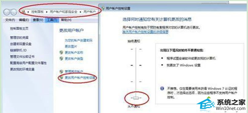 凭借良好的兼容性,winxp系统被广泛使用;在应用过程中,你可能会碰到winxp系统不能开零挂辅助的问题,有什么好的办法去解决winxp系统不能开零挂辅助的问题该怎么处理?虽然解决方法很简单,但是大部分用户不清楚winxp系统不能开零挂辅助的操作方法非常简单,只需要1、首先依次点击winxp系统的“开始—控制面板—用户账号和家庭安全—用户账号—更改用户账户控制设置—左侧拉到最下面(从不通知)”,设置完成后,重启计算机即可。 2、如果按照上述方法不行的话,请在winxp系统电脑桌面“我的电脑”上右击选择“管理”,在打开的计算机管理界面中点击“本地用户组——用户”,然后在右侧列表中右击administrator选择属性,在弹出的属性窗口中,去掉“账号已禁用”前面的勾选即可。就可以搞定了。下面小编就给用户们分享一下winxp系统不能开零挂辅助的问题处理解决。这一次教程中,小编会把具体的详细的步骤告诉大家。